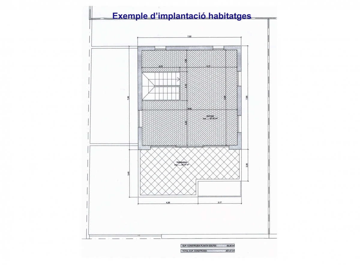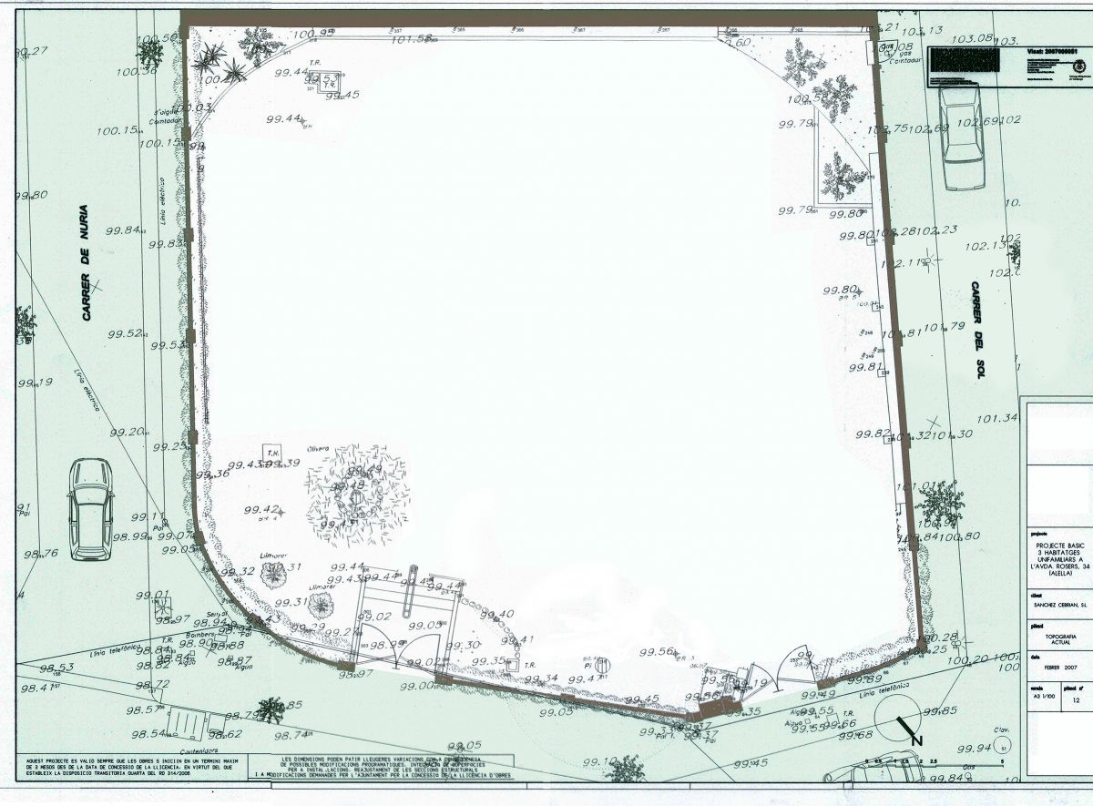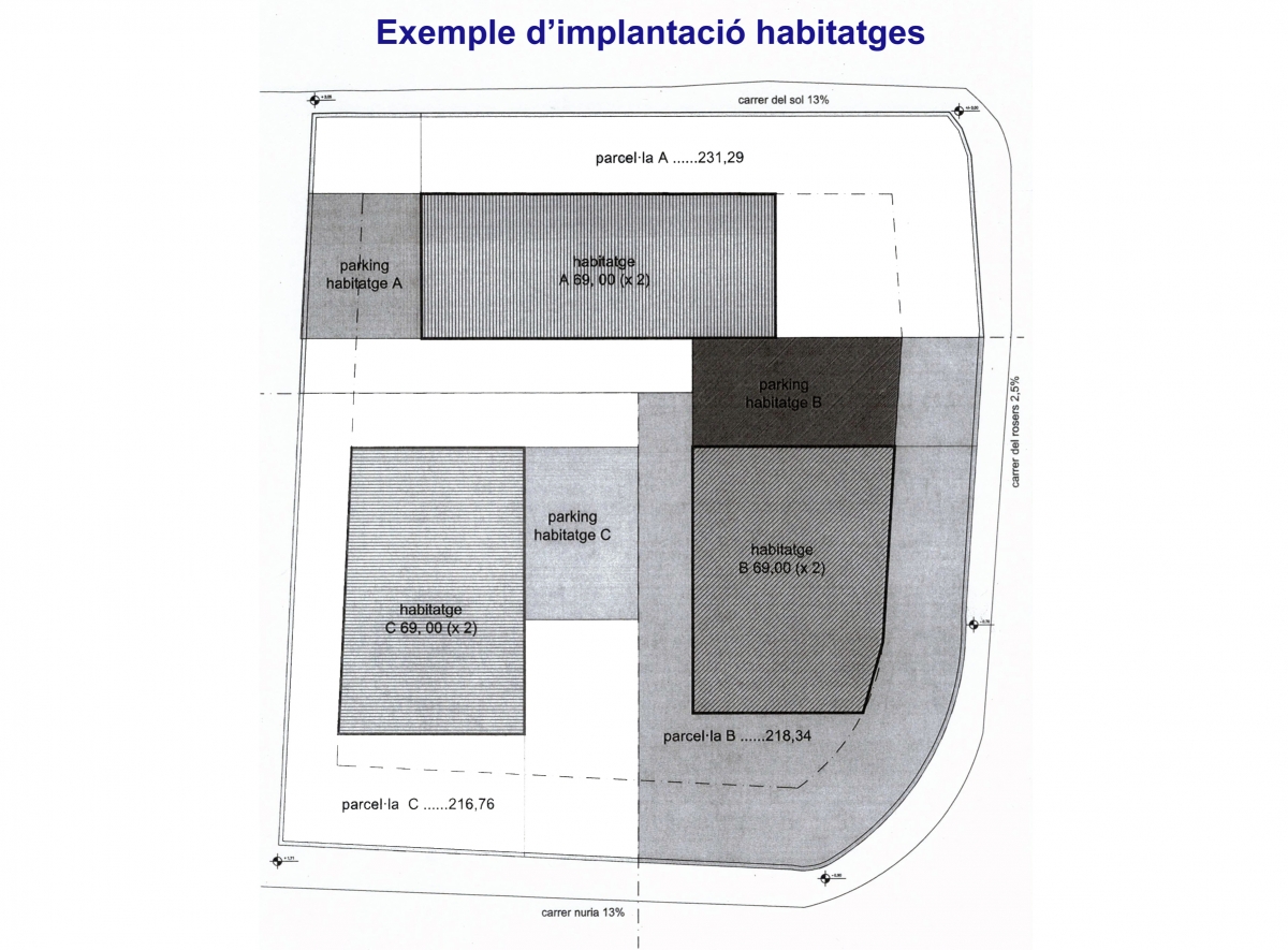 PARCELA AVDA. ROSALES, 34 ALELLA Según los datos topográficos, la superficie de la parcela es de 648 m2. En aplicación del artículo 238.2 de la normativa urbanística vigente, que admite una vivienda por cada 200 m2 de parcela, se pueden construir 3 viviendas. El coeficiente de edificabilidad es de 0,80 m2 st/m2 suelo, pero el artículo 241 establece que, cuando se agrupan dos o más edificaciones, el coeficiente de edificabilidad se reduce un 30%. Por tanto, el techo total que se podrá edificar será: 648 m2 suelo x 0,80 m2 st / m2 suelo - 30% = 363 m2 techo Por tanto, se pueden construir tres viviendas, con una superficie de 121 m2 cada una distribuida en planta baja y una planta piso y demás, según el artículo 238.11, se puede construir una planta sótano, que puede ocupar hasta un 50% de la superficie de la parcela, así como un altillo bajo cubierta cuyas dimensiones depende. En resumen, se pueden construir hasta tres viviendas, ya sea las 3 independientes o emparejando 2 y 1 independiente, cada una de ellas de una superficie construida de 121 m2 distribuida en planta baja y planta piso, más una planta sótano de unos 60 m2 y un altillo bajo cubierta de superficie a determinar.